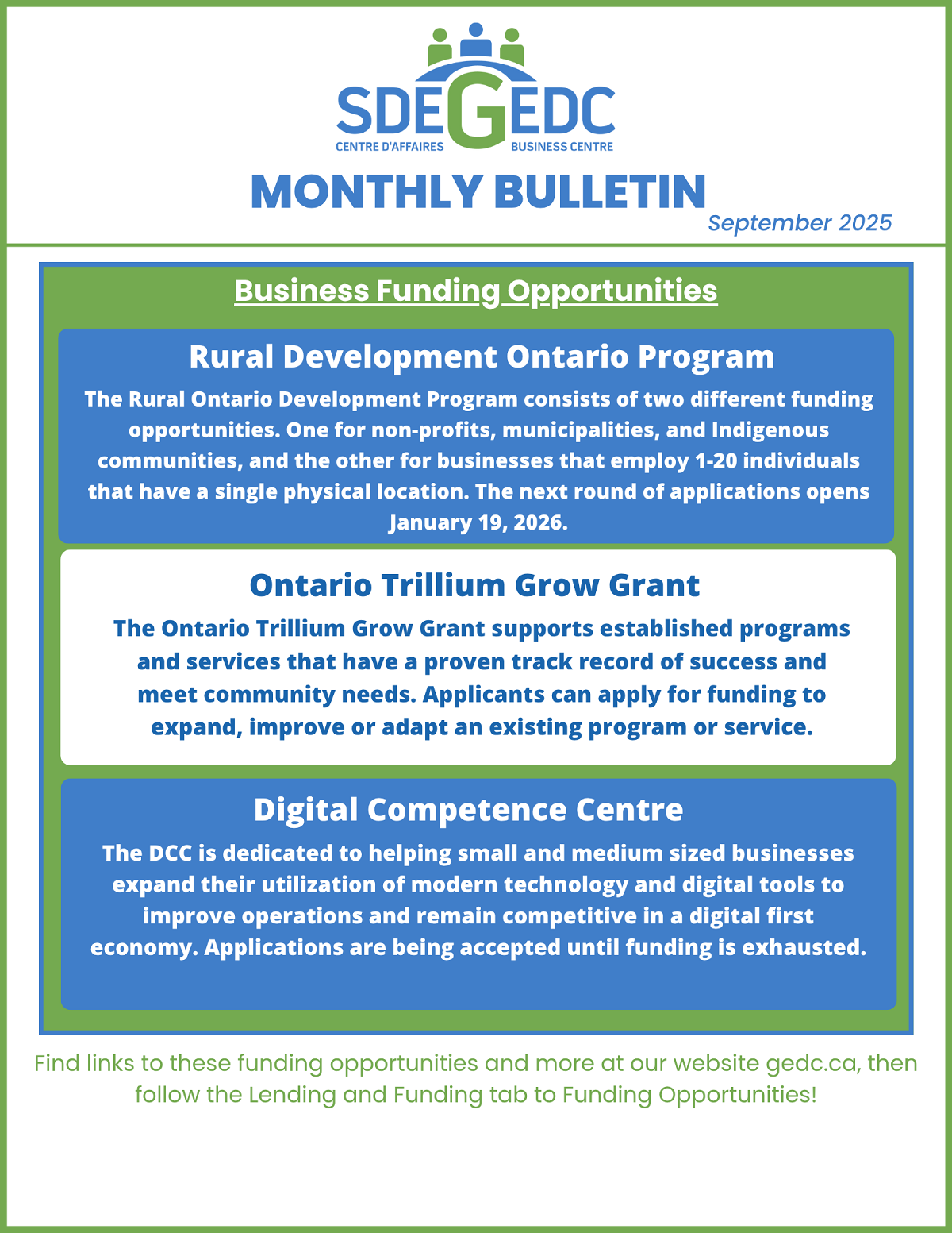 Greenstone Economic Development Corporation creates monthly bulletins with a variety of news topics, valuable insights, tips, and event updates. You can view and/or download any of 2025's newsletters below or sign up today and get the next edition straight to your inbox! If you would like to be added to the bulletin mailing list, please email Avery at reception@gedc.ca.